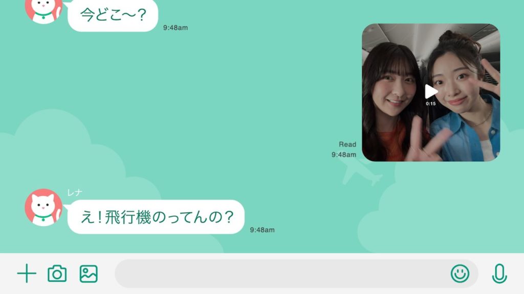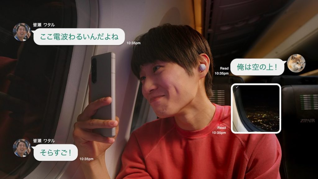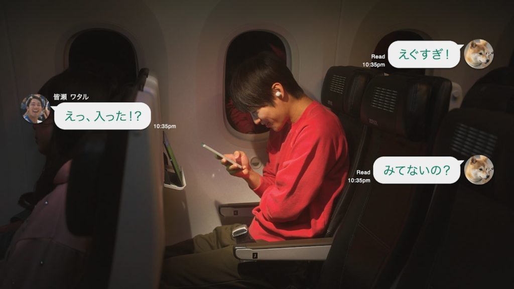 空の上でも地上と変わらないインターネット環境を実現した新しい移動体験を描いています。リモートワークやオンラインコミュニケーション、スポーツのリアルタイム視聴といった利用シーンを通して、機内での過ごし方の変化を表現しました。