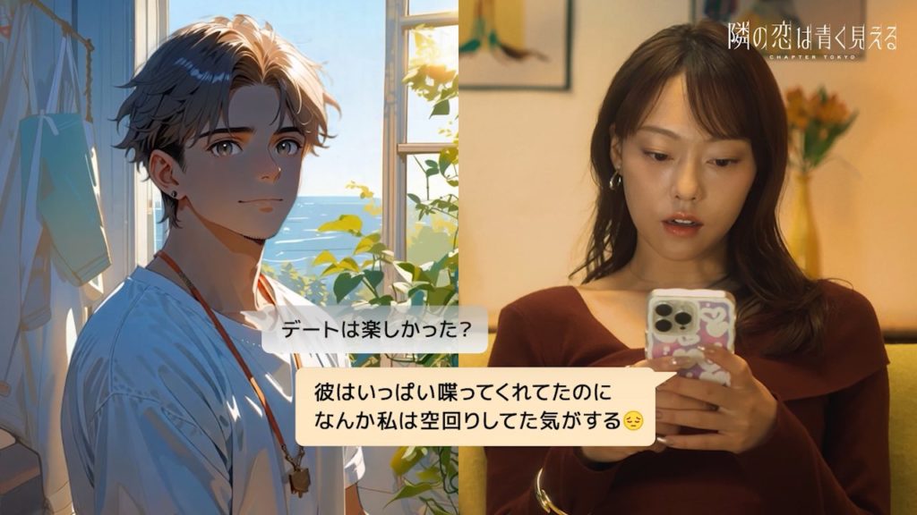 ABEMAで配信中の恋愛リアリティーショー『隣の恋は青く見える』と、AIロマンスチャットアプリ「Cookie Chat」のコラボレーションCMを制作しました。番組内の恋愛模様とアプリ上でのコミュニケーションを重ね合わせ、AIとの関係の中に生まれるときめきを描いています。